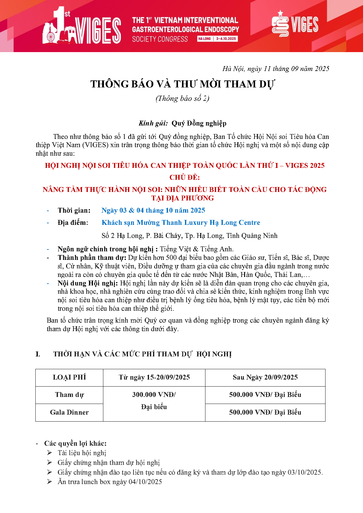 HỘI NGHỊ NỘI SOI TIÊU HÓA CAN THIỆP TOÀN QUỐC LẦN THỨ I – VIGES 2025: THÔNG BÁO SỐ 2